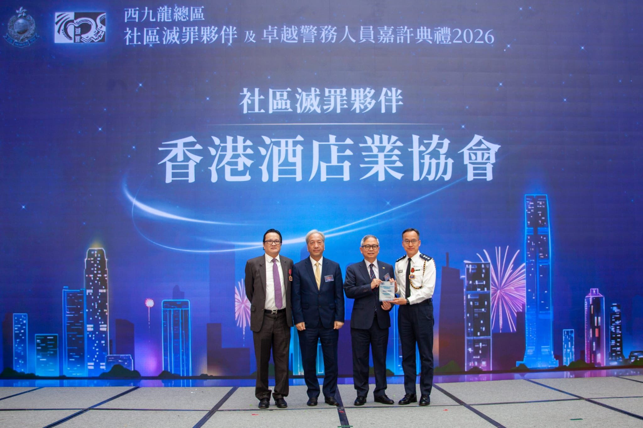 The Hong Kong Hotels Association was honoured to be recognised as one of the “Community Crime-Fighting Partners” on March 9, at the “2026 Kowloon West Region Community Crime-Fighting Partners Commendation Ceremony.” This recognition highlights the Association’s active support for community safety initiatives and crime-prevention efforts, underscoring its steadfast commitment to fostering a secure environment for hotels and visitors alike.