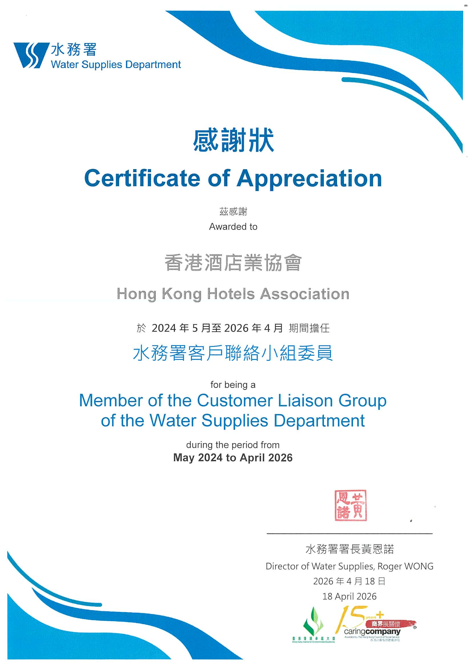 The Association has completed its two-year term with the Customer Liaison Group of the Water Supplies Department. During this period, it actively participated in committee work, exchanged views with the Water Supplies Department and other members, and made suggestions on service standards to enhance communication and improve service quality.