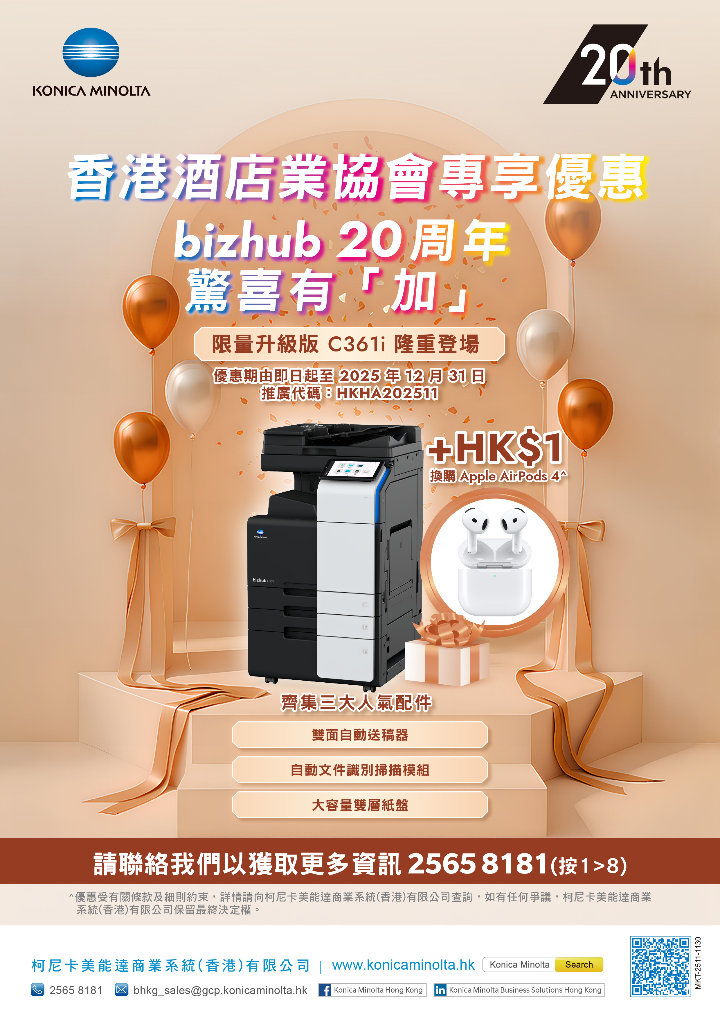 为庆祝bizhub 20周年,柯尼卡美能达推出「限量升级版C361i」多功能打印机,齐集三大超人气配件: 1. 双面自动送稿器 2. 大容量纸盘 3. 自动文件识别扫描模组,再加上每分钟36页的A4打印速度、易用的操作介面,以及强大安全防护,在办公效率、资讯安全及智慧管理各方面上都可以全面「加」值!